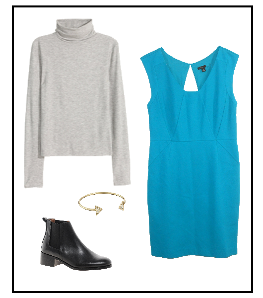 Why not add some vibrant color into the dull winter routine? Topping the grey turtleneck with a turquoise dress drops a tap of sweetness onto the cool neutral palette.